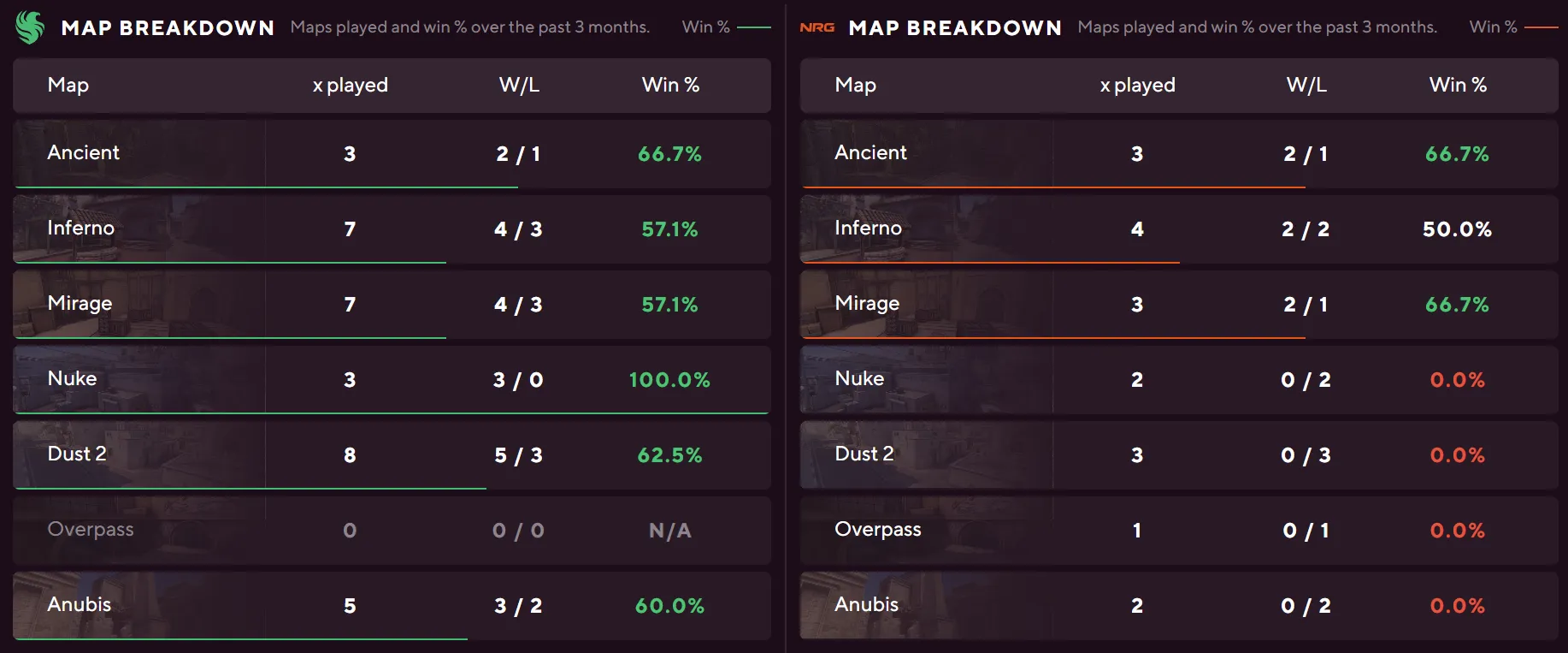 Team Falcons hold a strong position heading into this one. Their Nuke win rate sits at 71% across 14 maps, with five bans from opponents showing how much teams respect them on that pool. NRG's Nuke numbers tell the opposite story: a 33% win rate from nine maps and 14 bans from NRG themselves signal they actively avoid it. On Anubis, Falcons carry a 60% win rate while NRG have gone 0% from two maps played. The map pool leans firmly toward Falcons throughout.