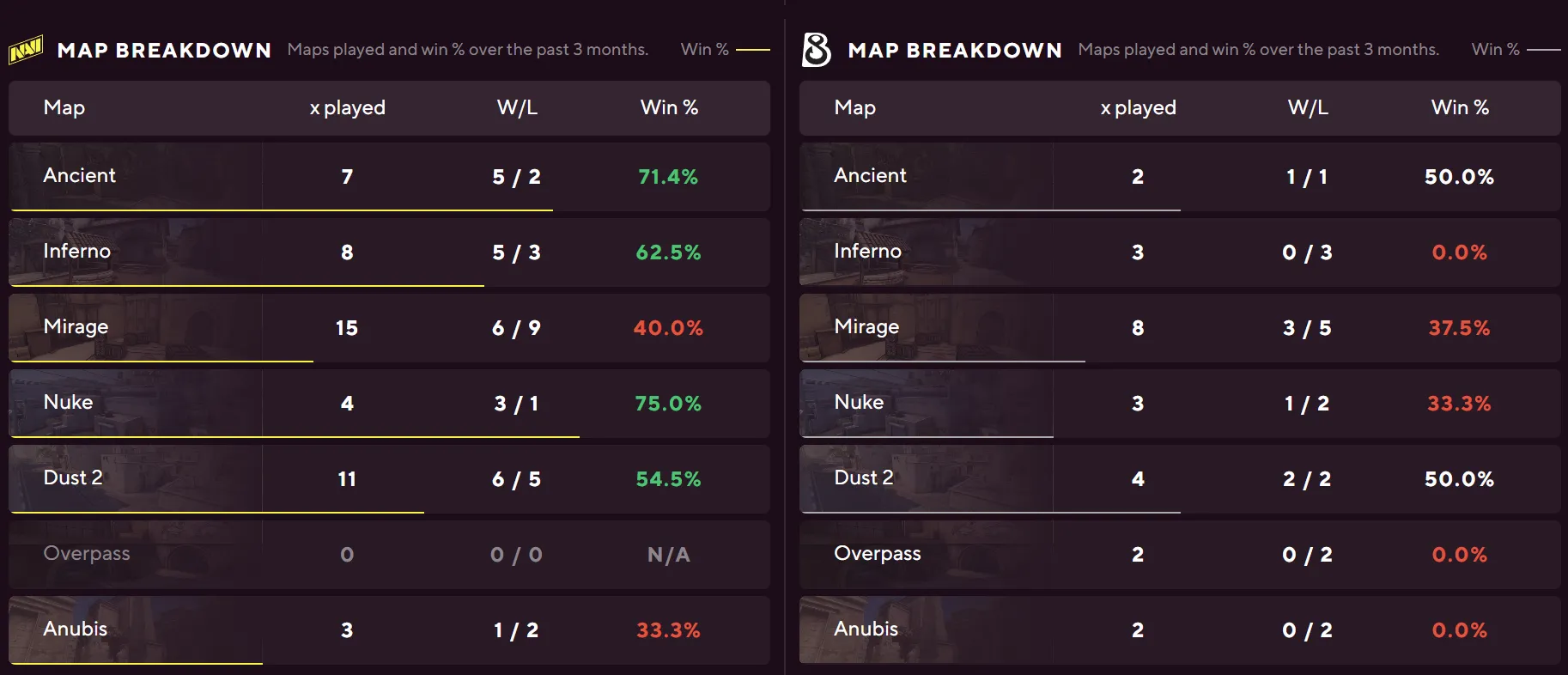 NAVI enter this match with comfortable advantages across the shared pool. Their Dust II win rate reaches 63% from 16 maps, compared to B8's 38% from the same map count. On Inferno, NAVI sit at 50% while B8 have managed just 27% from 11 maps. B8 have also gone 0% on Anubis across two maps played, while NAVI hold 33%. The numbers consistently point one direction.