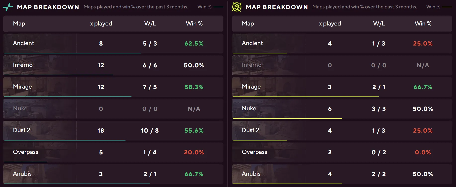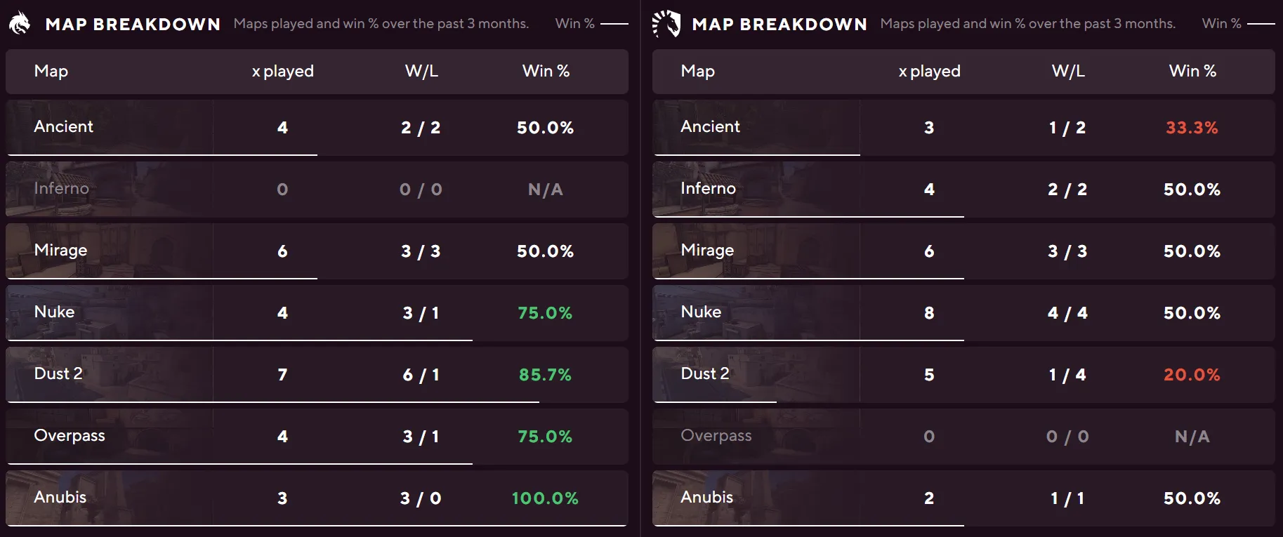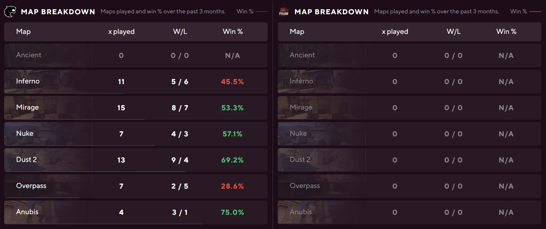 Furia's numbers across the board dwarf what TYLOO bring to the server. A 75% Anubis win rate, 64% on Dust II from 22 maps, and 58% on Inferno from 26 maps give them depth throughout the pool. TYLOO have zero maps played on Anubis and Dust II in the tracked sample, and their only meaningful pool presence is Inferno at 33% from nine maps.