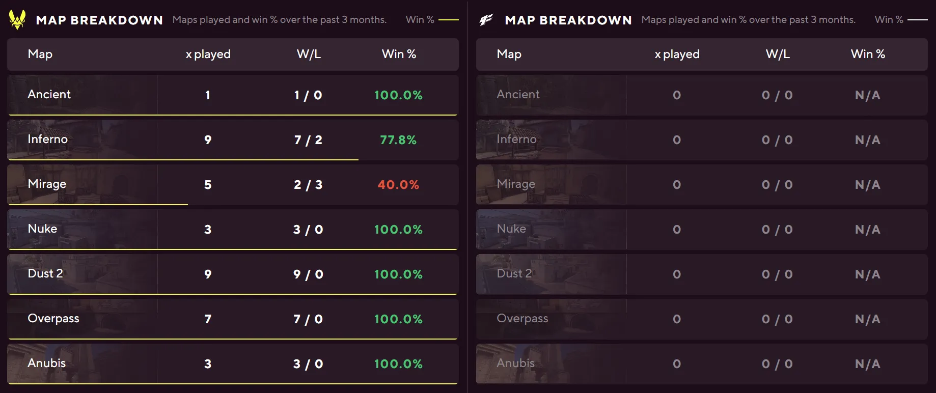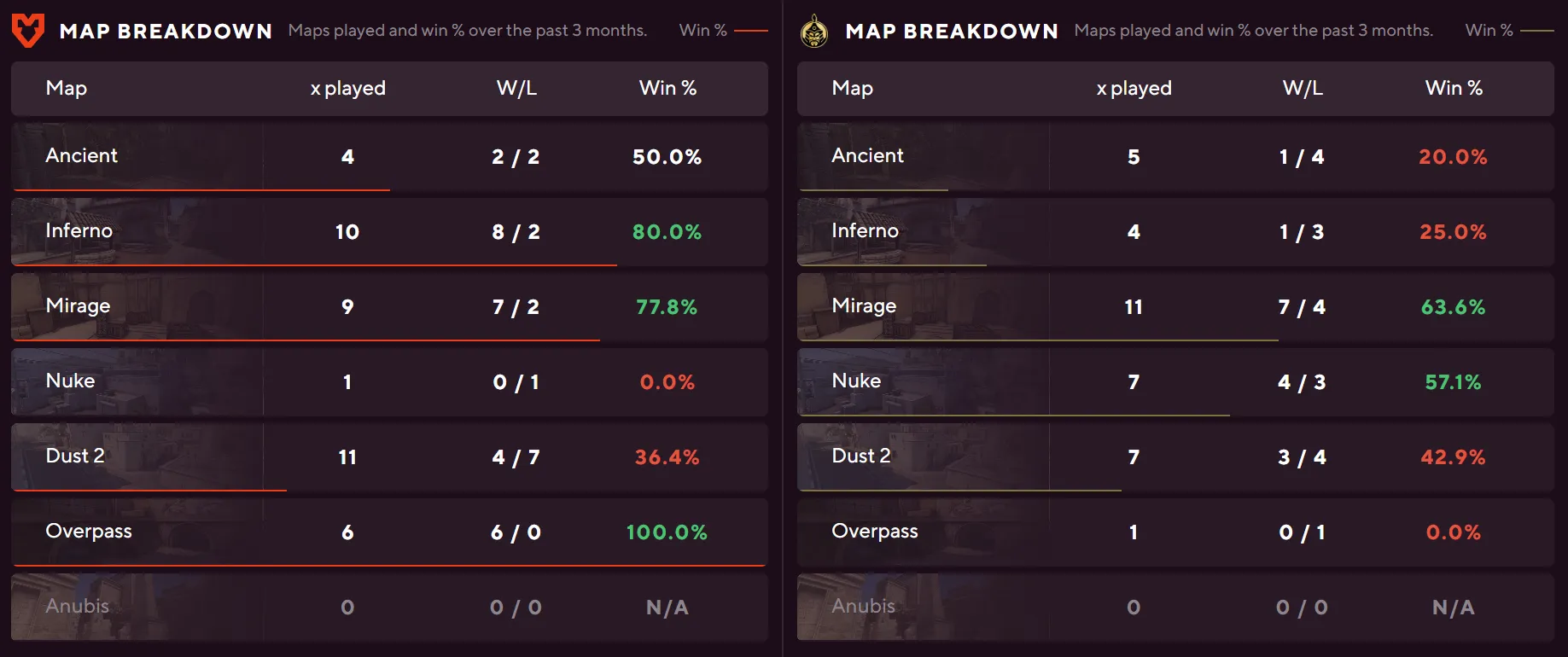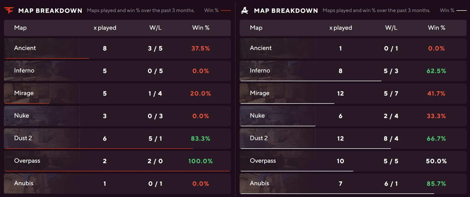 Furia's numbers across the board dwarf what TYLOO bring to the server. A 75% Anubis win rate, 64% on Dust II from 22 maps, and 58% on Inferno from 26 maps give them depth throughout the pool. TYLOO have zero maps played on Anubis and Dust II in the tracked sample, and their only meaningful pool presence is Inferno at 33% from nine maps.