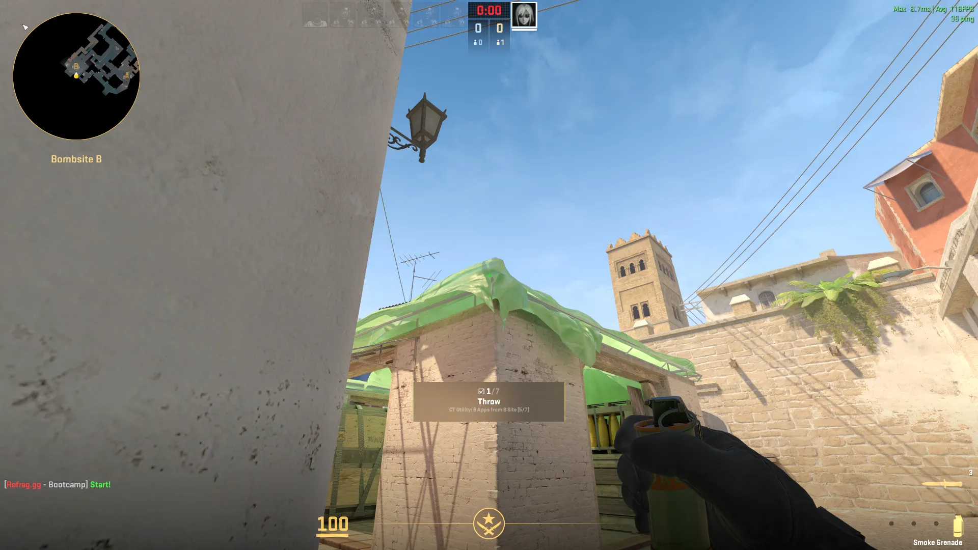 Effective CT utility deployment on B site focuses on delaying terrorist executes and fragmenting coordinated pushes. The apartments smoke stands as the most critical piece of CT utility, cutting off terrorist vision from the upper apartments area and forcing them to push through smoke or wait for it to dissipate. This smoke lineup, thrown from inside B site, lands perfectly to block the apartments entrance while maintaining CT positioning flexibility.