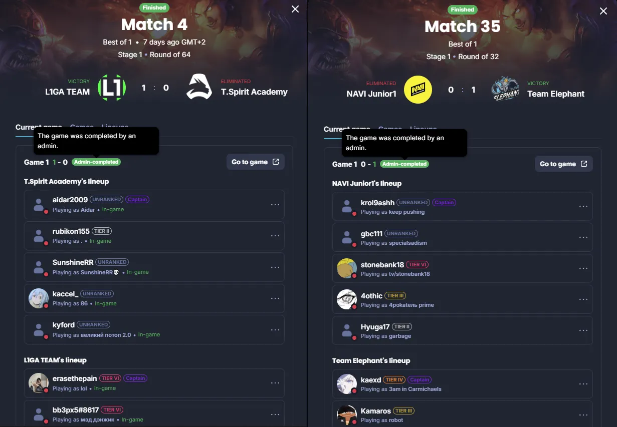 The decision follows tournament regulations preventing organizations from fielding multiple rosters in the same competition. Similar concerns have emerged regarding NAVI Junior's participation, as Natus Vincere's main roster may also compete in BLAST Slam VI. Both Team Spirit Academy and NAVI Junior matches were marked as "The game was completed by an admin" on the Challengermode portal.