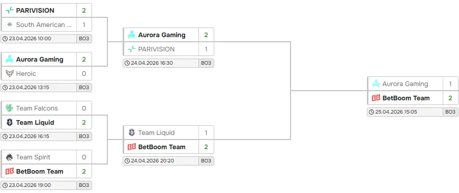 In the upper bracket quarterfinals, Aurora dismissed HEROIC 2-0, BetBoom eliminated Team Spirit, Liquid beat Falcons, and PARIVISION knocked out South America Rejects. The upper bracket semifinals produced extended battles. Aurora recovered from a 29-minute game-one loss to PARIVISION, winning games two and three in 43 and 59 minutes, with Rafli "Mikoto" Fathur Rahman posting a 19-6-34 kill-death-assist ratio for Aurora. BetBoom edged Team Liquid 2-1 in three maps, with Ilya "Kiritych" Ulyanov finishing at 23-9-34 and Michal "Nisha" Jankowski recording 22-14-25 for the losing side.