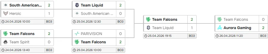 BetBoom Team and Aurora Gaming filled the vacuum left by the top seeds, becoming the only two teams to finish the Swiss stage with 3-0 records. BetBoom swept Virtus.pro and Team Liquid in their first two rounds before taking down Falcons 2-1. Aurora ground through three consecutive 2-1 series against South America Rejects, Xtreme Gaming, and PARIVISION to claim their spot. The remaining playoff qualifiers were PARIVISION, Team Liquid, Falcons, South America Rejects, HEROIC, and Team Spirit, a bracket shaped less by expectation than by survival. Any Dota 2 betting site attempting to model that playoff field was working with a completely different set of contenders than the ones it had priced before the event began.