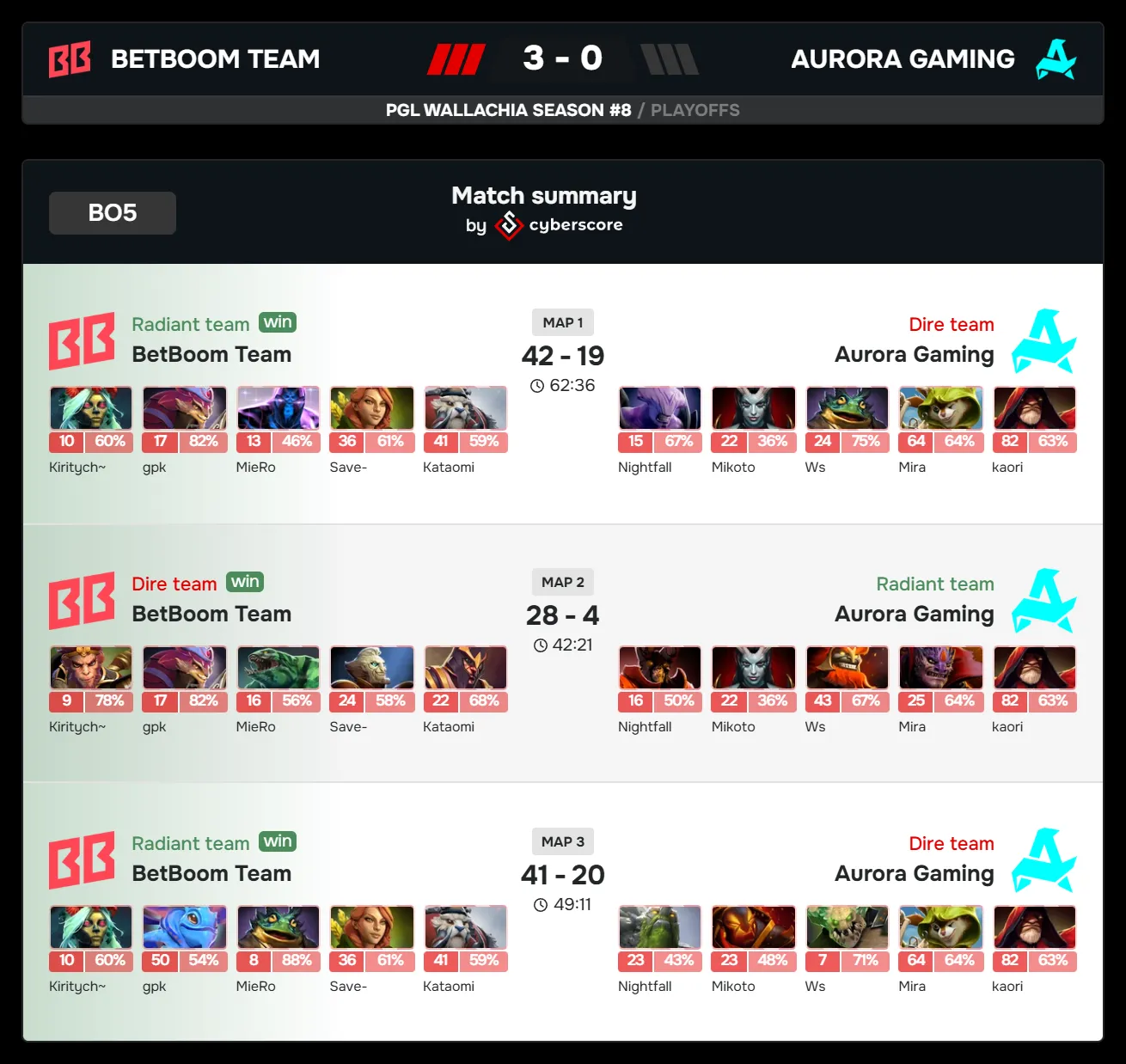 BetBoom handled the grand final in three maps. The opening game lasted 62 minutes, with both rosters playing a cautious positional game before BetBoom proved more controlled in the closing team fights. Game two finished in 42 minutes and game three in 49, giving BetBoom a 3-0 sweep and the $300,000 first prize. Aurora Gaming collected $175,000 for the runner-up finish. Falcons took third place and $120,000, with Team Liquid in fourth on $80,000. HEROIC and Team Spirit ended the tournament in joint seventh and eighth on $40,000 each. Tundra and Yandex finished 15th-16th on $10,000 apiece.
